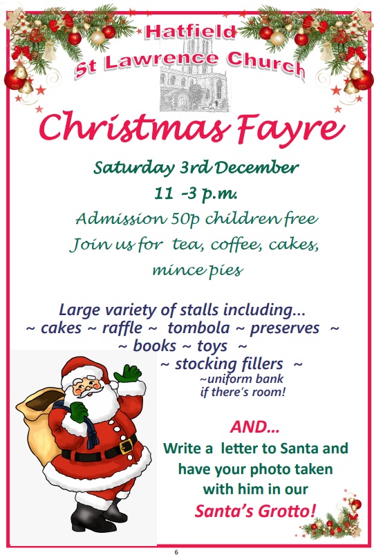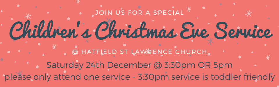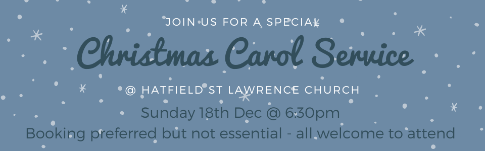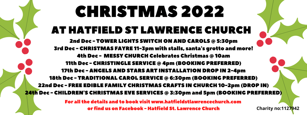 Hatfield St Lawrence Church would like to invite you to join us for one of our many services, events and activities this advent and Christmas season. Please find details below, including any booking links (booking preferred but NOT ESSENTIAL – everyone is welcome at all of our services).